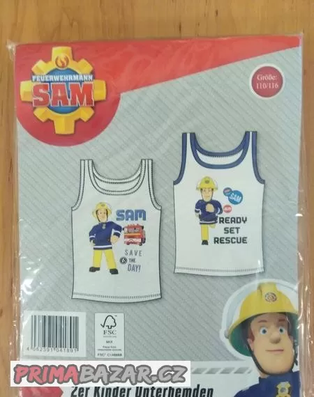 Prodám sadu nových, nikdy nenošených chlapeckých tílek s požárníkem Samem vel. 110/116. Cena za 2 ks: 150 Kč včetně poštovného.