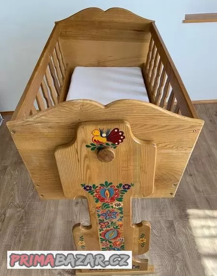 Prodame dětskou ručně vyřezávanou kolébku z jasanoveho dřeva. Je ručně malovana z roku 1979. Možnost zabezpečeni pohybu kolébky.