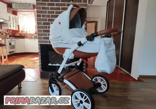 pevnou hliníkovou konstrukcí jednoduchý mechanismus skládání rukojeť kočárku a rukojeť na stříšce vaničky vyrobené z ekologické kůže a obšité ozdobnou nití v barvě potahu kočárku regulovatelná výška rukojeti amortizovány zadní kola nafukovací kola otočná přední kola s možností blokády automatická centrální brzda objemný koš na nákupy praktický systém skládání kočárku ONE CLICK systém ANTI SHOCK