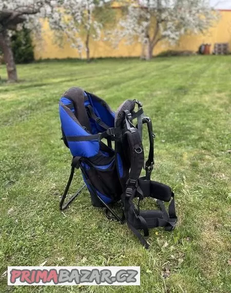 Modrá barva, polstrování zad, bederní popruh, boční přezka pro nástup dítěte z boku.