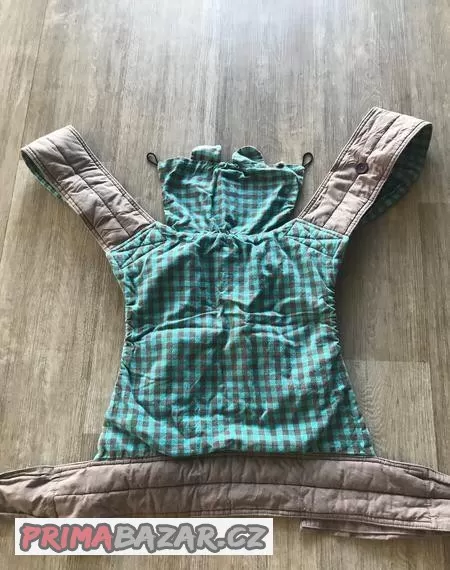 Jedná se o nosítko šité na míru. Je vhodné i pro vyššího tatínka/maminku, nechávali jsme ušít s prodlouženými ramen. popruhy i bederního pásu. Nosítko je oboustranné- z jedné strany tyrkys/hnědá kostičky, z druhé světle hnědé… oboje příjemné neutrální barvy jak pro kluka tak holčičku. Materiál je příjemná pevná bavlna. Součástí je i kapucka s oušky, která se dá přichytit, když miminko usne, vypolstrovaný bederní pás a taštička na nosítko třeba do kočárku.