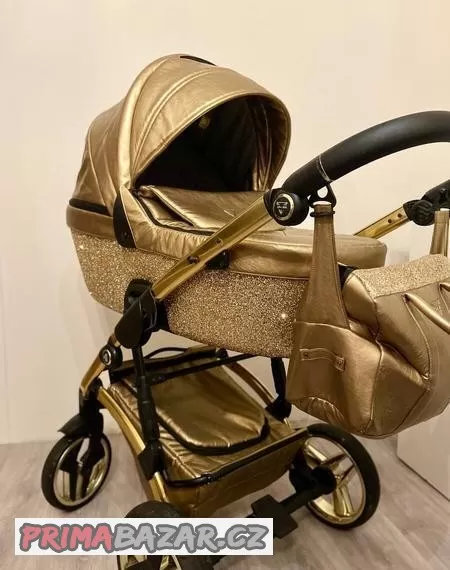 Prodám Kočárek Junama Termo Glitter - Gold. Po jednom dítěti. Nepoškozený jen mírné oděrky na konstrukci po skládání do auta. Taška má odřené poutka. Ke kočárku je pláštěnka,moskytiéra,držák na pití a rukavice. Pouze osobní předání