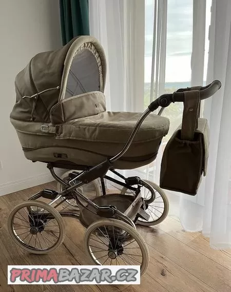Korbička kočárku je velmi prostorná, miminko se v ní po pár měsících nemačká. Přední kolečka s aretací, možnost houpání miminka, velká kola projedou i náročný terén. Na kočárek lze nasadit kompatibilní autosedačku, viz foto. V sadě nová taška na kočárek (použita jednou) top stav.