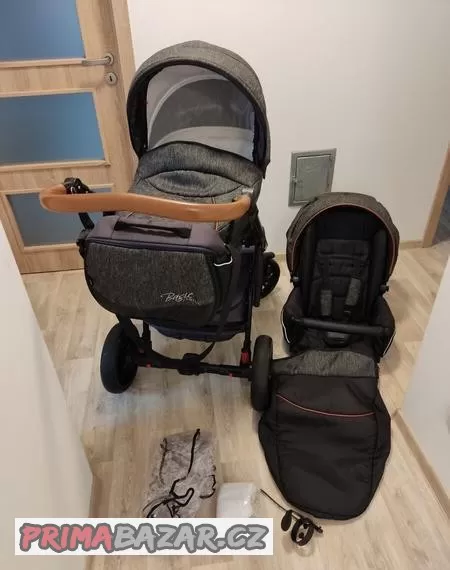 Prodám kočárek dvojkombinaci zn. Dorjan Basic Comfort VIP barvy anthracite. Jedná se o hlubokou korbičku a sporťák. Možnost aretace předních kol, kola gelová (obě přední kola nová), odpružený, korbička i sporťák se dají otáčet po směru a proti směru jízdy. Součástí je úložný koš, nánožník, přebalovací taška, síťka proti hmyzu, držák na nápoje (nový), pláštěnka - ta je lehce protrhlá od nasazování. Koš a přebalovací taška jsou lehce vyšisované od sluníčka. Konstrukce jeví známky používání od skládání do auta. Perfektní parťák do obtížnějších terénů - lesy, louky, pole apod.