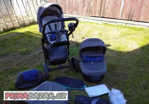 Kočárek je po dvou dětech. Korbička je jako nová, stejně tak i sporťák, ale chybí tam část zapínání, takže popruhy nelze zapnout. Konstrukce je poškrábaná, ale je to je estetická vada, na funkci ti vliv nemá.