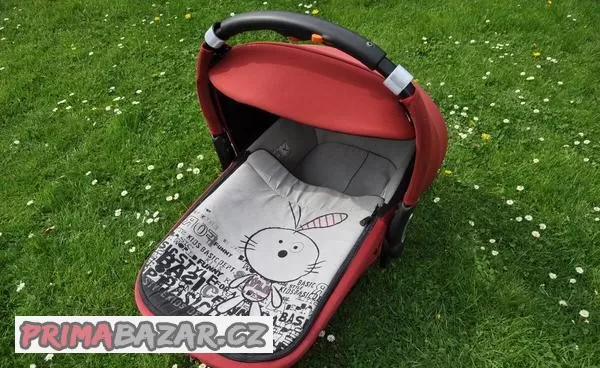 Součástí také taška na kočár, menší taštička na doklady, miminkovník do autosedačky pro zafixování hlavičky novorozeněte, nánožník. Upevnění do auta isofix.