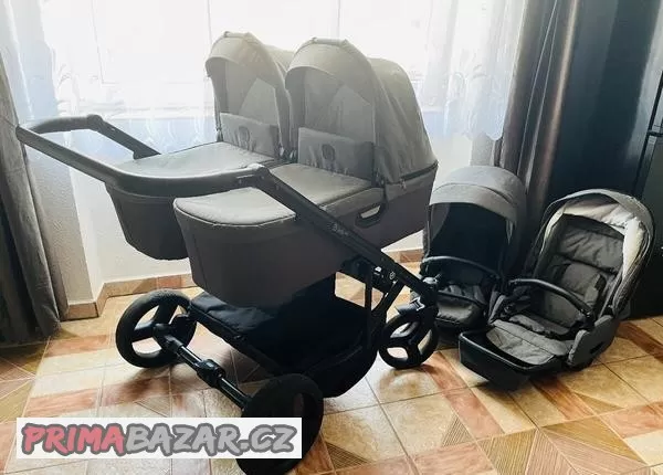 Dvojkombinace + příslušenství - pláštěnky, síťky, clony, velká taška. Přidám 2ks prostěradel (pro holčičky). Vše v krásném stavu.