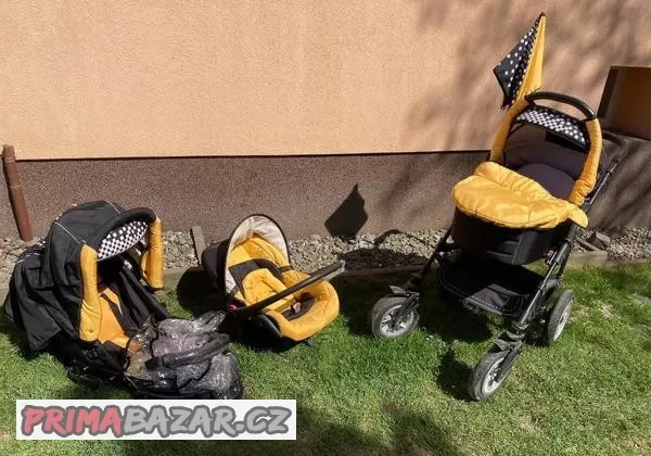 Kočár trojkombinace. Nutno vyměnit jedno přední pneu a jedno přední kolo. Na konstrukci viz foto rez. Nutno vyprat/vyčistit polstr/potah na sportovní části kočárku. Jinak na pohled stále moc pěkný. Ke kočárku deštník, pláštěnka, taška. Pouze OSOBNÍ odběr.