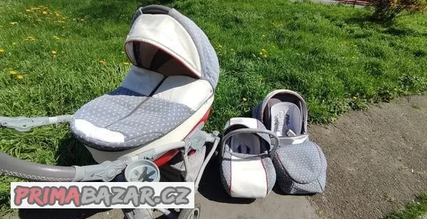 Prodám trojkombinaci kočárku Camarelo Vision (hluboká korba, sporťák, autosedačka). Kočárek má nafukovací kola a odpružený podvozek. Hluboká korba, sporťák i autosedačka lze dát po i proti směru jízdy. Kočárek má držák na pití a polohovací madlo.