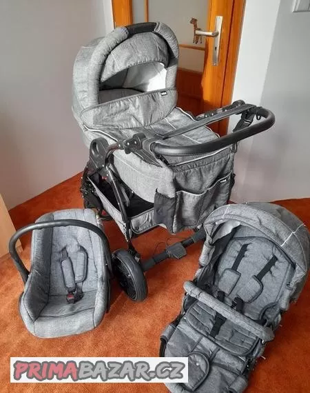 Prodám kombinovaný kočárek - trojkombinaci (hluboká a sportovní korbička, vajíčko) + moskytiéra. Přebalovací taška a košík pod korbičkou jeví známky opotřebení. Vše vyčištěno, z nekuřáckého prostředí.