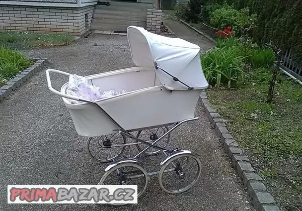 Nabízím bílou Libretu vyrobenou v polovině 60.let.Komu nebudou vadit malé kosmetické skvrnky na boudičce, schované pod krajkou nebo páskou. Starý kočárek má už nárok na tyto vady.Jsou zohledněny v ceně.Podvozek i kolečka jsou naprosto v pořádku.Slida se nenašla,místo ní dávám plymo vyplněné růžovo modrými peřinkami. Jen osobní předání ve Dvoře Králové n.L.