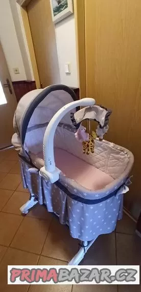 Prodám zachovalý kočárek - postýlku s hracím kolotočem. K tomu je ještě hrací oboustranná deka.