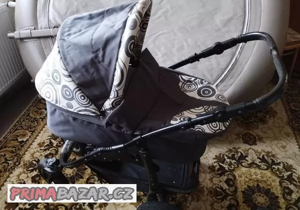 Ke kočárku další výbava jako síťka na korbičku, pláštěnka na sporťák, přebalovací taška na připnutí na kočárek a zdarma přidám dečku do kočárku. Barva kočárku je šedá a stříška krémová s šedými vzory. Kočárek má brzdu a přední kolečka, která se zadají zablokovat aby se neotáčela.