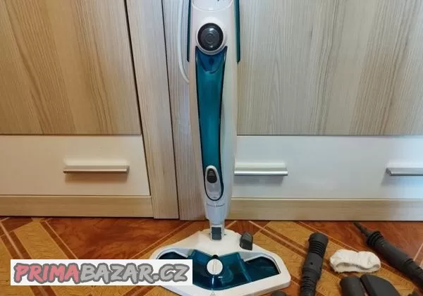 Parní mop 400ml nádoba na vodu 150ml nádoba na saponát zahřátí za 30 s provoz s párou 20 min kontrolka nahřátí příkon 1 500 W 5m kabel hadice pro lepší dostupnost stěrka na hladké povrchy parní rozptylovač úhlový nástavec koncentrovací tryska čisticí textilie detailové kartáček. Mop je používaný cca 2x...cena 1200,-Kč