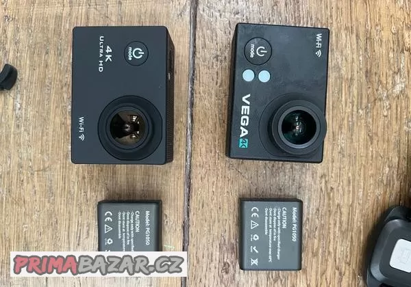 Dvě akční kamery. Jedna Niceboy Vega 4K a druhá no name co jsem dostal. Spousta ruzných kloubků a držáčků, hrudní držák, držák na zápěstí a držák na čelo. Jedna baterie navíc.