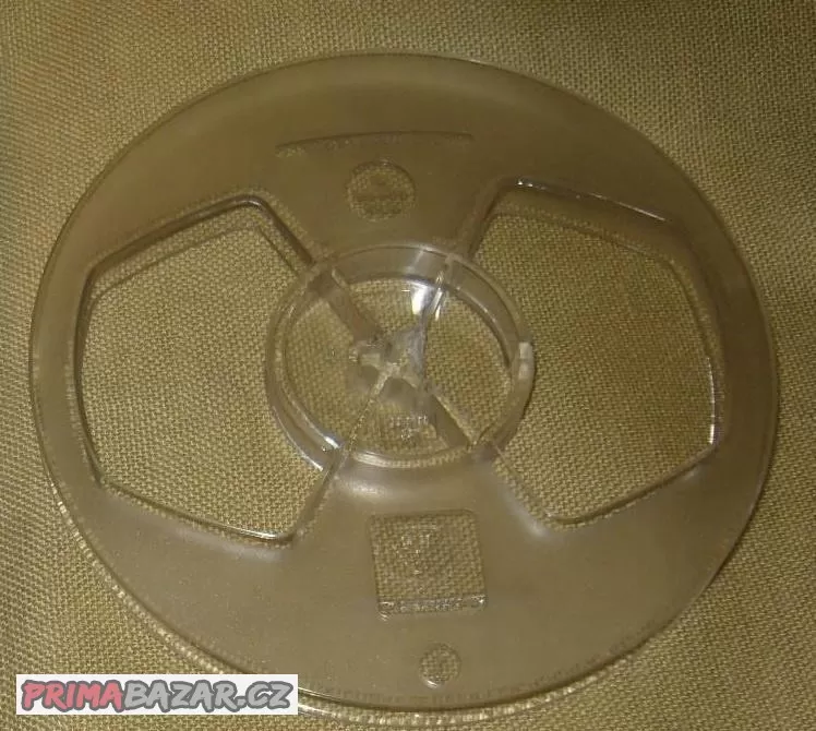 Plastové cívky značky LNH na kotoučový magnetofon. K nim také šedé krabičky FLB.
