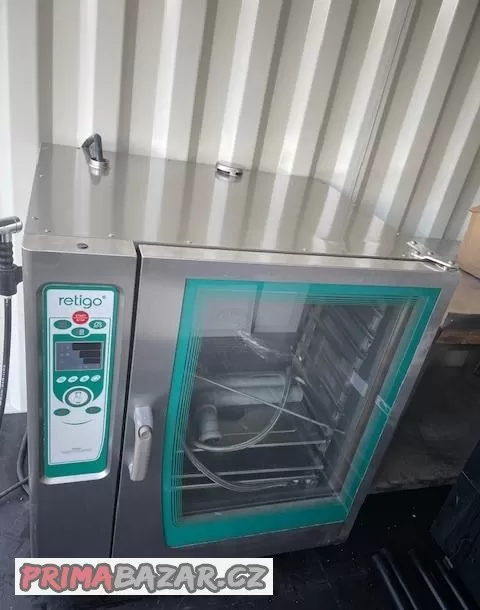 2. Elektrický konvektomat Retigo (steam convection) – 10x GN 1/1, nástřiková verze. Umožňuje zdravější úpravu pokrmů, bez použití tuků. Můžete využít několik programů. Díky horkému vzduchu můžete péct, grilovat, smažit a připravovat pokrmy z mouky. Parní režim využijete při přípravě zeleniny, rýže, brambor. Rozměry 92 x 79 x 104 v cm (DxŠxH). PC: 100 000kč, nyní cena: 35 000kč