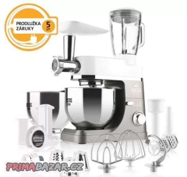 Kuchyňský robot ETA Gustus IV Maximus s výkonným 1200 W motorem je jako stvořený pro práci v kuchyni. Pochlubit se může stabilizátorem, který udrží nastavené otáčky i při velkém zatížení a pohání jej odolná kovová převodová kola, díky kterým s vámi bude opravdu dlouho.