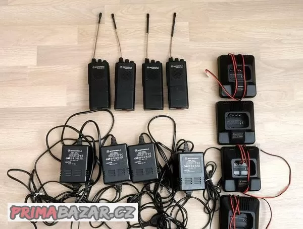 Prodám 4 ks vysílaček Motorola GP s alternativními bateriemi a modifikovanými nabíječkami.