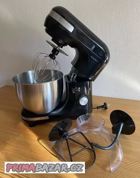 Prodám kuchyňský robot Silvercrest. Vhodný na šlehání, míchání a hnětení. Hnětací hák a míchací metla mají nepřilnavý povrch. Výkon 600 W, v pohodě zvládne 500 gramů mouky. Poradí si i s jedním bílkem. Plynulá regulace rychlosti otáček. Výklopné rameno s pojistkou. Součástí je nerezová mísa 5l s ochranným krytem proti stříkání.
