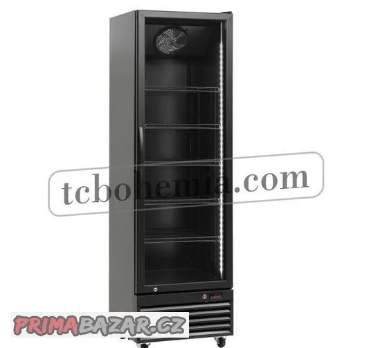 Lednice s prosklenými dveřmi s ventilovaným chlazením, digitálním termostatem, svislým bílým LED osvětlením, samozavírajícími dveřmi, zámkem, 5 nastavitelnými drátěnými policemi.