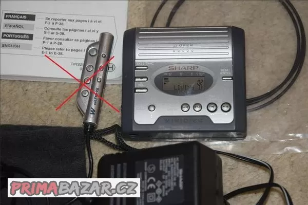 MINIDISC recorder SHARP, plně funkční = nahr./přehrávání, editace apod., provoz na 1x AA baterii / nabíjecí AA akku. Provoz taktéž přes síťovou nabíječku /součást aukce/.