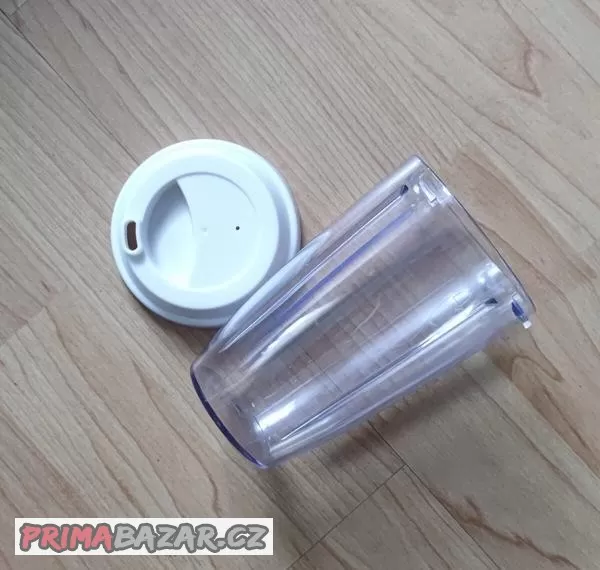 Prodám nádobku ke Smoothie mixéru s víčkem na pití. Nepoužívaná. Úchyt na bajonet. Průměr nádoby 89mm, výška 140mm, průměr přez úchyty 100mm. Objem cca 550ml.