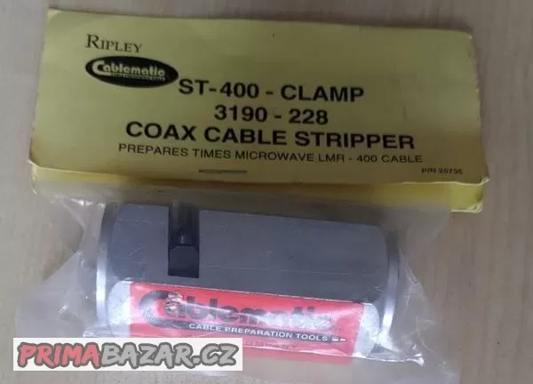 Nový, nepoužitý, v původním balení ořezávač RIPLEY Cablematic ST-400 (Cromwell, Connecticut, USA) kabelů LMR 400 (3/8" kabel, 50 Ohm), stejný koax je RG 213, RG 8/9913 nebo RG11, včetně návodu k použití. Jeden konec ořezává plášť, druhý dielektrikum, řezací nože je možné přenastavit či vyměnit.