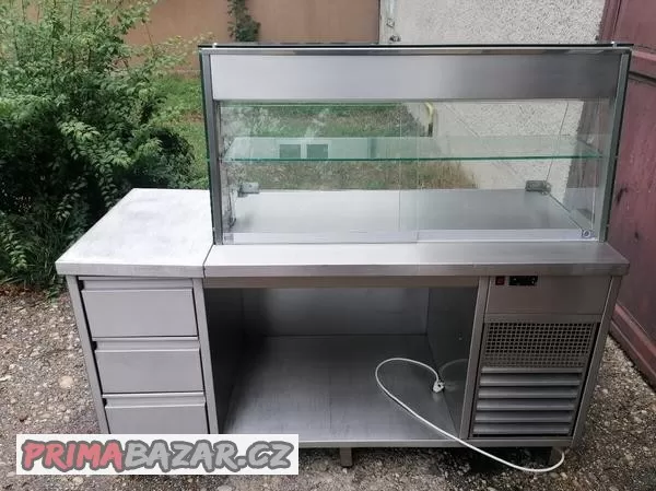 Predám chladiacu vitrínu s nerezovým stolom vhodnú na zákusky alebo bagety. Rozmery: 160 x 70 cm, výška 140 cm, vitrínka 120 x 55 cm, výška 56 cm. Stolík nad zásuvkami 40 x 70 cm.