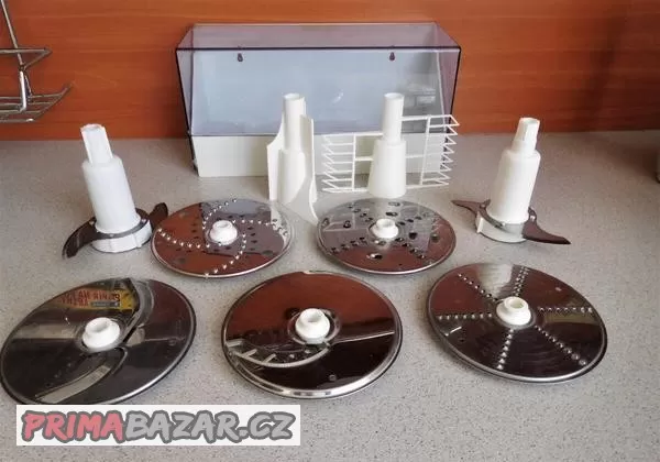 Nabízím příslušenství ke kuchyňskému robotu ETA 0024 - 5x různé krouhače a struhadla (některé zcela nové, nepoužité) viz foto + 2x srpovitý nůž, 1x hnětací nádstavec, 1x šlehací nádstavec, úložný box na krouhače, návod, 1x nádoba s víkem a tlačidlem. Na víku je prasklina a chybí zobáček. Cena 1.200 Kč. Zaslání přes Balíkovnu, nebo Zásilkovnu s kódem.
