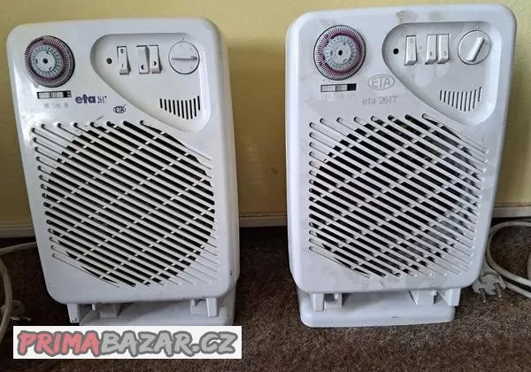 Prodám: 1) elektrický teplovzdušný ventilátor ETA 2617, přepínač příkonu 1000/2000 W, časový spínač, teplý/studený vzduch + 2) přímotopný konvektor TURBOPLUS 2000 CATA, příkon 750W/1250W/2000W, možnost zavěšení na zeď.