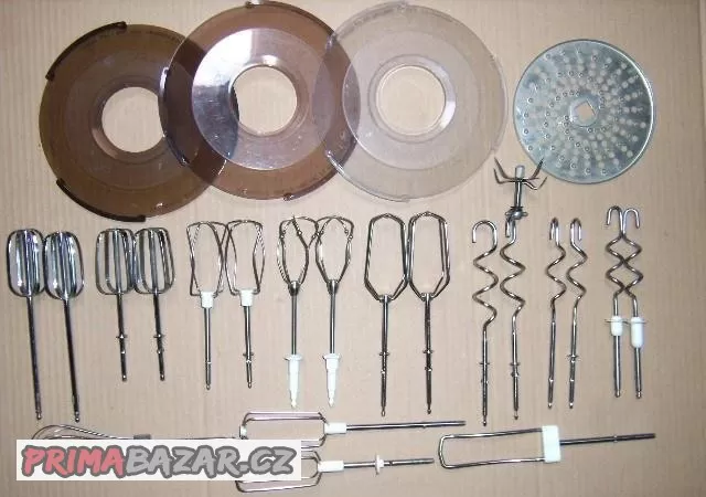 Nabízím jednotlivé ND: jednotlivé metly pro různé značky ručních šlehačů; víka nádob; kotouč strouhače (průměr 16cm); hřídelku mixeru s noži. Vše viz. foto. Jedná se o příslušenství a shodné náhradní díly k ROBOTŮM Eta 0010; 0012; 0022; 022; 0221 a 011 Mira. Prohlídka a vyzvednutí kdykoliv v Lounech, případně dle dohody. CENA: dohodou, dle vybraných věcí.
