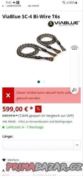 Prodám profi kabely pro reproduktory i z konektorovými pozlacenými banánky. VIABLUE sc4 velice kvalitní made in germany v testech top.najdete na netu.délka kabelu 1,5m.původní cena 12000kč za 1 metr nyní prodávám za oba kabely 3990kč .lze poslat českou poštou po odeslání peněz na účet na dobírku neposílám!!!při koupi poštovné hradím já jako bonus!!!!