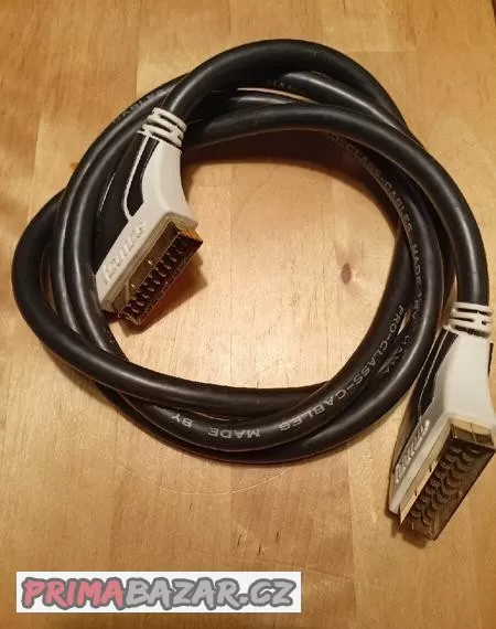 Prodám Scart vidlice - Scart vidlice, kabel vhodný pro propojení DVD, videa, videokamery na TV, projektor apod., vhodný pro S-VHS, 21-pin, plně osazený, dvojitě stíněný, OFC kabel, PE-izolace, pozlacené konektory, dl.1,5 m.