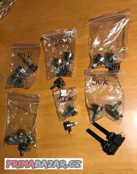 Prodám komplet potenciometrů do zesilovačů či jiných stereo komponentů, hodnoty 10k, 20k a 50k. Celkem 21 kusů, viz fotky.