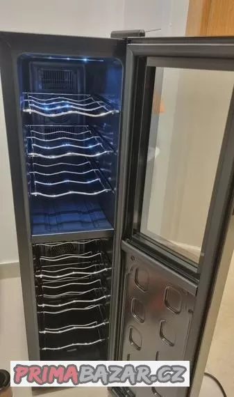 Volně stojící vinotéka Hyundai VIN 18 DZ v elegantním černém provedení s prosklenými dvířky je vybavena drátěnými policemi, na které můžete uložit až 18 lahví vína; 8 lahví v horní zóně na červené víno a 10 lahví ve spodní zóně na bílé víno. Nastavení rozdílných teplot. Osvětlení. Velmi dobrý stav.