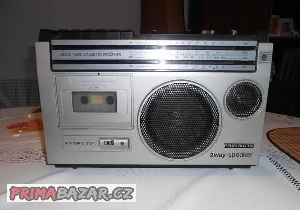 Prodám hezký vintage čtyř-pásmový radiomagnetofon FAIR MATE (ASAHI) CR-360 z roku 1972. Přístroj je opticky velmi hezký, čistý. Rádio ladí, kazeta hraje i přetáčí. Jedinou drobnou závadou je chybějící anténa, ale na fungování tuneru to nemá velký vliv. Rozměry 360x240x100mm, hmotnost 2,8kg.