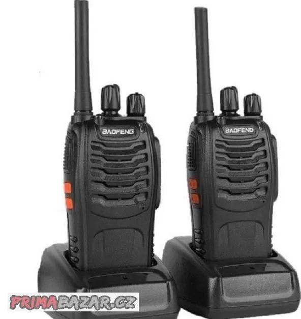 UHF vysílačky Baofeng BF-888S je ruční radiostanice. Vysílačka má 16 přednastavených kanálů, dlouhý komunikační rozsah frekvence 400-470MHz. Vysílací výkon 5W. Funkce VOX s nastavitelnou citlivostí. Výdrž baterie až 4 hodiny provozu (až 1 den v režimu stand-by). LED svítilna. Dosah vzdálené komunikace až 5 km. FM rádio (65.0MHz-108.0MHz). Baterie 1500mAh. Rozměry: 115 x 60 x 33 mm. Hmotnost: 150g. Balení = 2ks vysílaček + baterie + stojanová nabíječka. Nepoužité.
