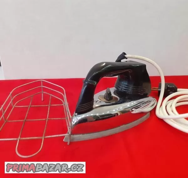 Prodám pěknou žehličku z 50.let. Výrobce Elektro Praga Hlinsko, určeno pro sběratele, funkčnost nezkoušena - bez záruky, stav viz .foto. typ ETA 230T-220V-800W Mohelnice včetně starožitné drátěné podložky pod žehličku. Spodní část je čistá, bez rzi.