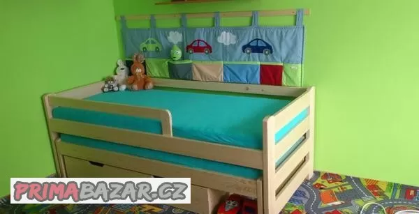 Prodám 2 postele z masivu s laťkovým roštem a úložným prostorem viz. foto (bez matrací a hraček). Vrchní lůžko má rozměr 200*90. Spodní lůžko má rozměr 190*90. K posteli je i kapsář a klouzačka viz. foto.