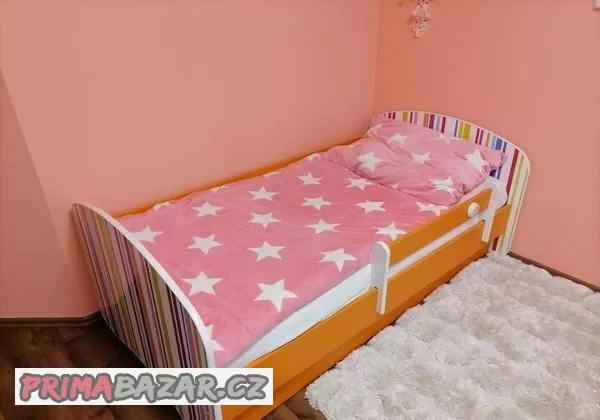 Prodám dětskou postel, zachovalá, bez poškození, rozměr 180 x 90 cm, dřevěný prkenný rošt, případně včetně zdravotní matrace, s vysouvacím úložným prostorem.