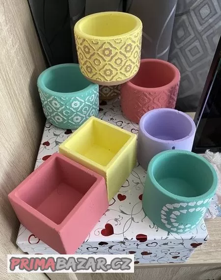 Betonové květináče různých barev, tvarů a velikostí. Ruční výroba. Na obědnávku různé kombinace barev.