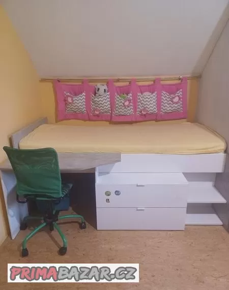 Prodám postel se stolem a šuplíky po jednom dítěti. Rozměr postele 90x200 s roštem ale bez matrace. Na stolku je znát, že se používal. Pod postelí je ještě prostor pro hračky . Původní cena byla 7500,-kč. Pouze vlastní odvoz.