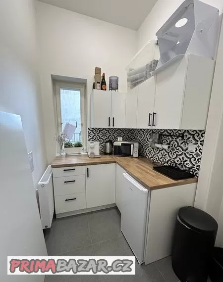 Prodám tuto rohovou kuchyňku, vyrobenou na míru. Včetně tapety - imitace kachliček. Sloužila pouze jako kuchyňka bez vody, pokud byste chtěli dřez, stačí vyřezat otvor nad rohovou skříňkou a napojit. Cena včetně lednice, bez lednice dohodou. 150x153,5 cm