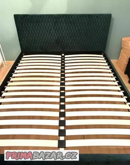 Predám čalounénú zelenú velvet manželskú postel rozmer 160x200cm s lamelovým roštom, stav postele nová - slúžila len na občasné prespanie.