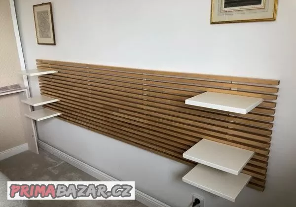 Prodám čelo postele z masivu bříza s postranními bílými nastavitelnými poličkami. Šířka 240 cm, výška 61 cm, hl police 28 cm. Police jsou vyjímatelné, variabilní. Perfektní stav. Cena 2800,- Kč.