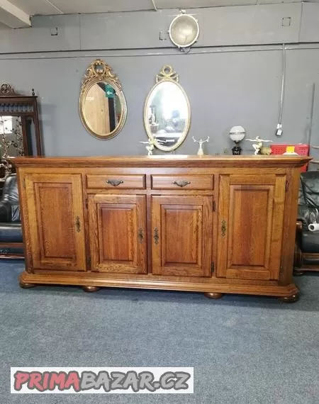 Holandský nábytek. Masivní včetně šuplíků, poliček a zadní desky. Tloušťka dvířek 3,5 cm. Speciálni zámky včetně 4 klíčů. Extra vysoká a dlouhá. Délka 260 cm, výška 121 cm, hloubka 55 cm.