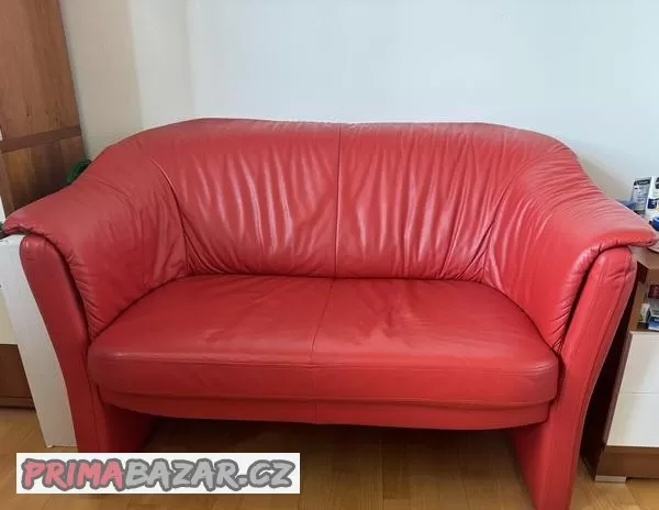 červený gauč pro dva, není rozkládací, s opěrkami, není prosezený. Celková šířka je 127cm, šířka bez opěrek je 97cm, délka je 76cm, výška zepředu je 68cm.