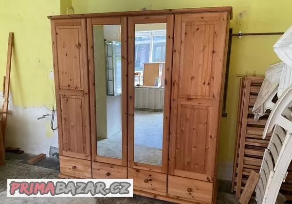 Prodám čtyřdveřovou skříň materiál voskované borovice plný silný Masiv rozměry 200 krát 200 cm × 60 cm velmi dobrý stav prohlédněte si také ostatní naše nabídky děkuji