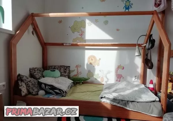 Dětská domečková postel přírodní dřevo. Šířka 86cm, délka 165cm, výška 123cm. Včetně roštu a matrace obyčejná 10cm s pratelným obalem. Výška u země je ideální na přechod že žbrlinkové postýlky. Moje dítě využívalo tuto domečkovku od 2do 4 let. Bez zjevných vad, používaná.